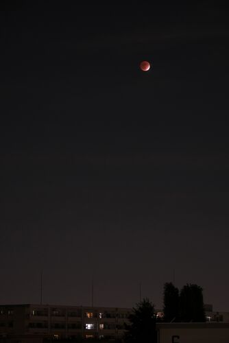 2021年11月19日のほぼ皆既という部分月食の写真。 雲に覆われていた時間が多かったですが、なんとか撮れました。 LUMIX GX7Mark2で換算113mm(高度が低いので建物も入れたかった) 設定は基本通りにF4.0でシャッター1秒、ISO200で調整しました。